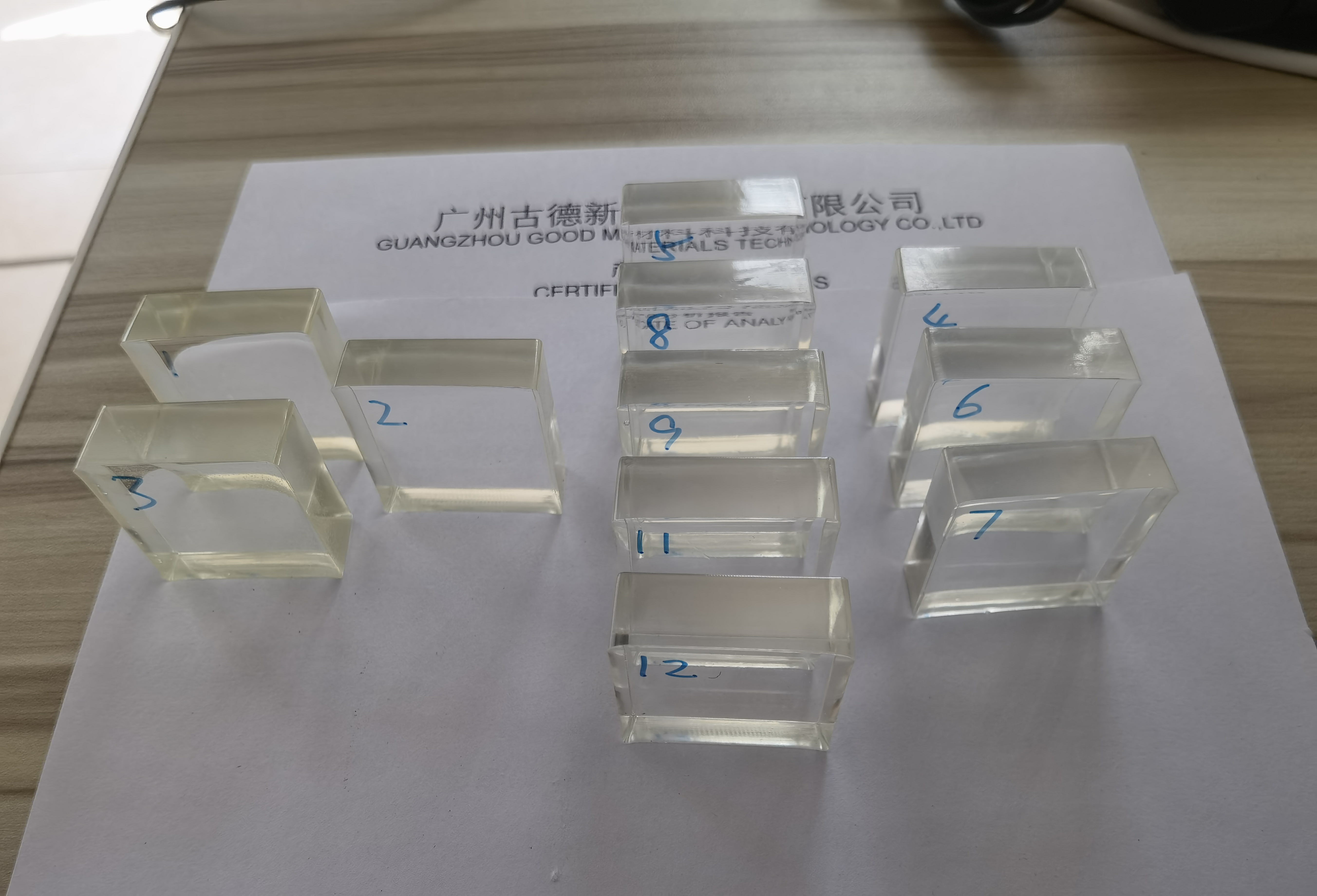 實驗材料:環氧樹脂128+苯甲醇+亨斯曼D230+抗黃變劑 實驗條件:實驗材料常溫固化48小時后,放在烤箱130度烘烤4小時;注:該實驗只針對該實驗材料與實驗條件,僅供參考,不同的固化劑與固化條件、儲存條件請自行實驗確定最終效果。